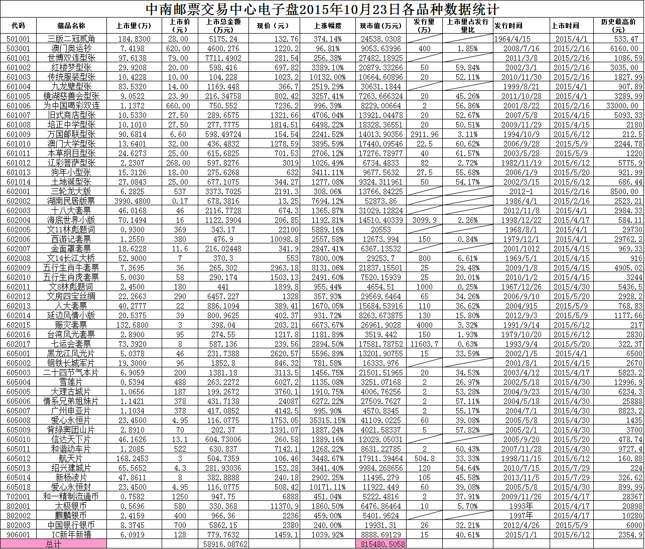 中南邮票交易中心电子盘2015年10月23日各品种数据统计