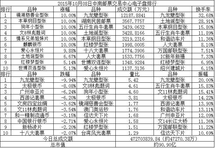 中南邮票交易中心电子盘2015年10月08日排行
