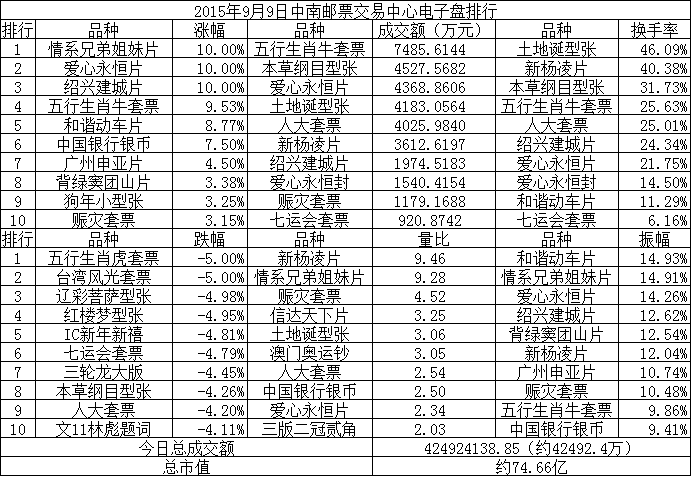 中南邮票交易中心电子盘2015年9月9日排行