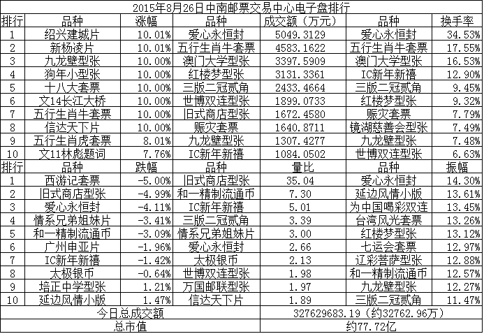 >> 中南邮票交易中心电子盘2015年8月26日排行