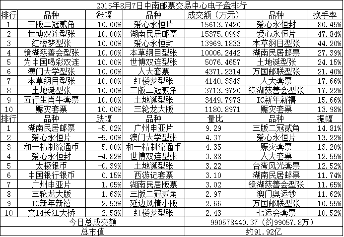 >> 中南邮票交易中心电子盘2015年8月7日排行