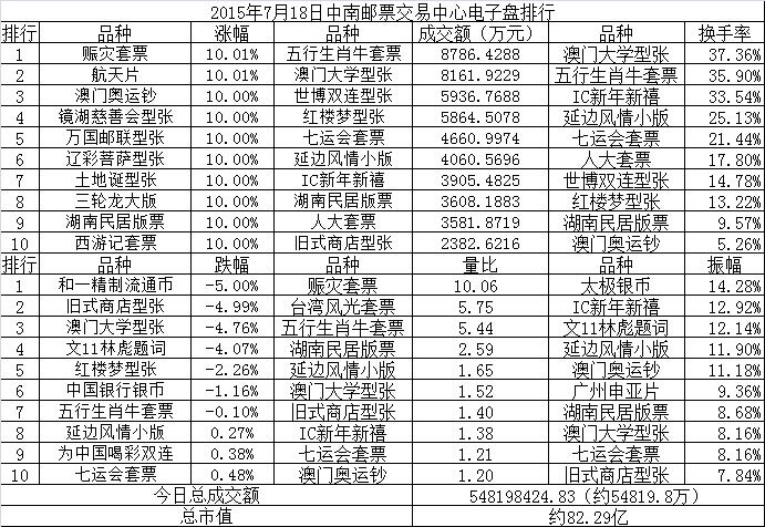中南邮票交易中心电子盘2015年7月18日排行