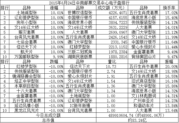 >> 中南邮票交易中心电子盘2015年6月24日排行