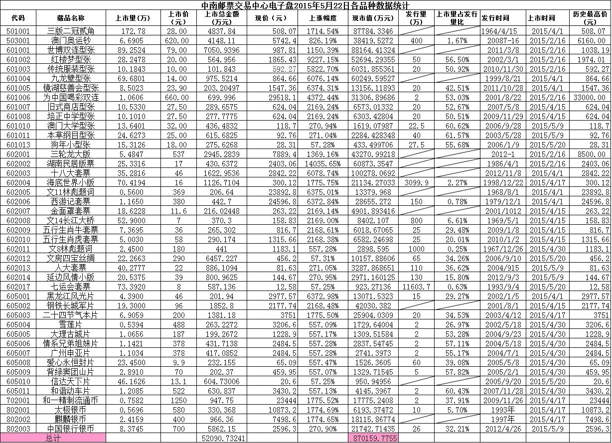 >> 中南邮票交易中心电子盘2015年5月22日各品种数据统计