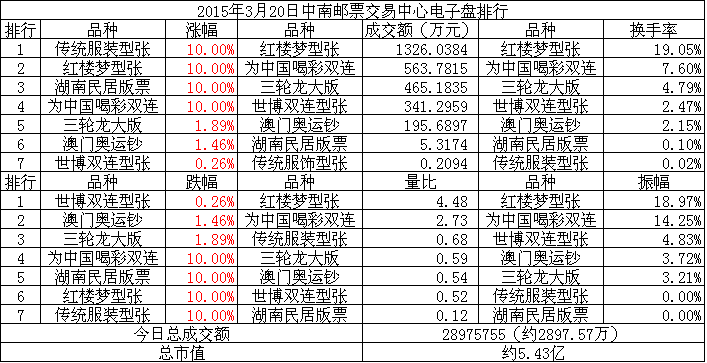 中南邮票交易中心电子盘2015年3月20日各品种数据统计