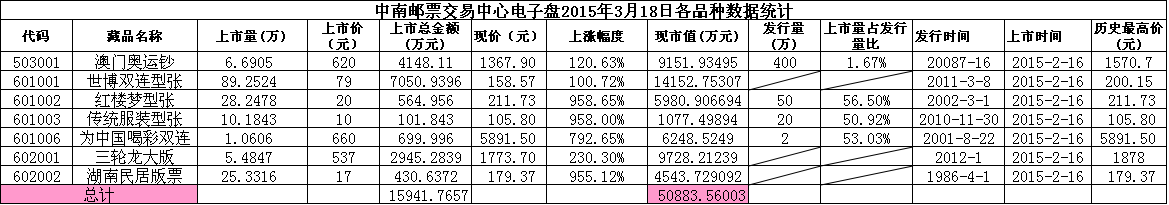 >> 中南邮票交易中心电子盘2015年3月18各品种数据统计