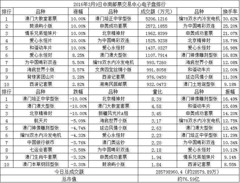 中南邮票交易中心电子盘2016年3月9日排行