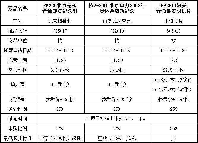 3、关于本次新藏品托管投资人会员的平均持有市值,投资人会员可以于各藏品托管申请结束日期后一个交易日(《北京精神封》查询日期为11月24日12:00以后,《申奥成功套票》查询日期为11月27日12:00以后,《山海关片》查询日期为12月01日12:00以后)电话向托管部或向中心客服咨询,或网上自助查询,查询地址:http://znyp.funwin.cn/jiang.php。