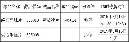 2015(风)第288号关于临时调整停牌控制措施的公告,属于藏品价格异常波动,本中心将对下列藏品采取停牌控制措施。具体停牌信息如下: