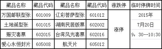 下列交易藏品于2015年7月16日、7月17日、7月18日连续三个交易日价格涨停,根据湖南省中南邮票交易中心有限公司《风险控制管理办法》等规定及2015(风)第288号关于临时调整停牌控制措施的公告,属于藏品价格异常波动,本中心将对下列藏品采取停牌控制措施。具体停牌信息如下: