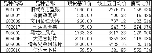 下列交易藏品2015年7月2日线上五日均价均已有效超过本中心现货基准价且超出部分达现货基准价的100%。