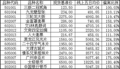下列交易藏品2015年6月15日线上五日均价均已有效超过本中心现货基准价且超出部分达现货基准价的100%。