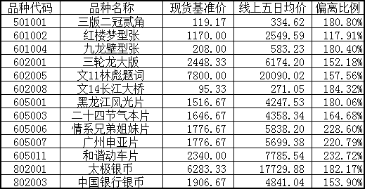 下列交易藏品2015年6月4日线上五日均价均已有效超过本中心现货基准价且超出部分达现货基准价的100%。