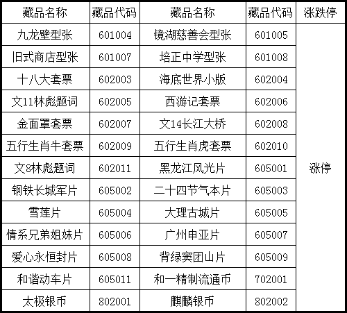 下列交易藏品于2015年5月8日、5月9日、5月11日连续三个交易日价格涨停: