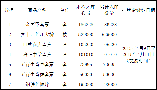 2015(托)第058号 《五行生肖虎套票》等藏品托管入库公告