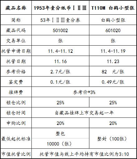 3、关于本次新藏品托管投资人会员的平均持有市值,投资人会员可以于各藏品托管申请结束日期后一个交易日(《53年ⅠⅡⅢ壹分券》查询日期为11月13日,《白鹤小型张》查询日期为11月20日)电话向托管部或向中心客服咨询,或网上自助查询,查询地址:http://znyp.funwin.cn/jiang.php。