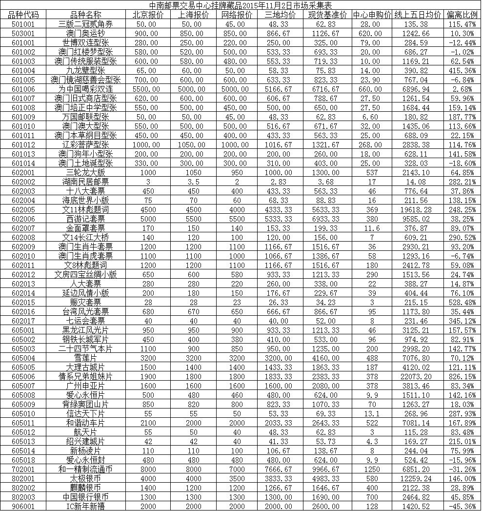中南邮票交易中心挂牌藏品2015年11月2日市场采集表