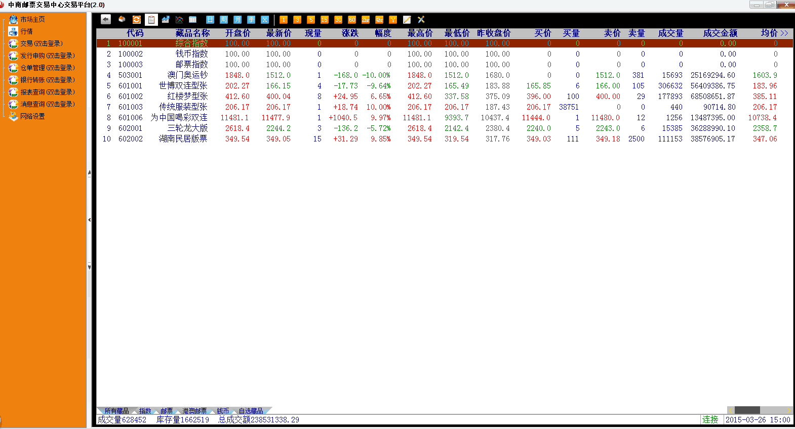 今天开盘伊始,除了尚未开板的传统服装型张外,其它六支藏品盘内交易活跃度频频高涨,与往日相比,换手率屡创新高,截止下午三点收盘,红楼梦型张换手率62.98%,湖南民居版票换手率43.88%,世博双连型张换手率34.36%,三轮龙大版换手率28.05%,澳门奥运钞换手率23.46%,为中国喝彩双连换手率11.84%;从成交量来看,总成交628452张,世博双连型张成交306632张,在七支藏品中拔下头筹;从成交金额来看,在下午1点17分24秒,七支藏品成交金额达到100043223.47元,在下午2点36分,总成交额达到200234046.53元,最后总成交金额以238531338.29元收官,其中红楼梦型张68508651.87元,七支藏品中位居第一。而且,综观盘内行情走势,部分藏品博弈激烈,从开盘到收盘上演过山车振奋行情。
