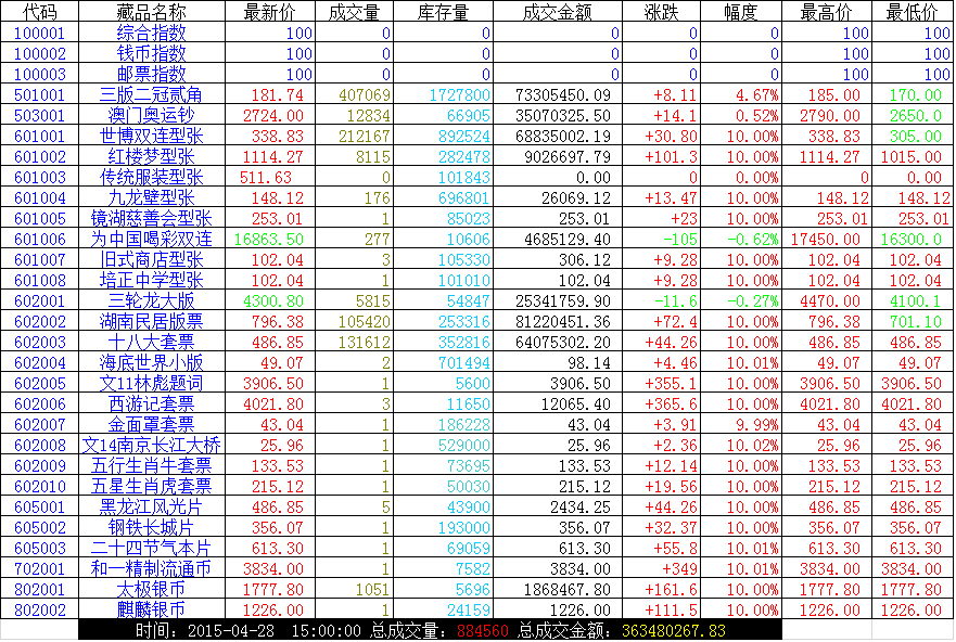 市场疯狂是这个市场的属性,外部南京市场行情疯狂,两大市场均有新品申购,但短期看申购吸引资金流出交易市场规模有限,市场整体行情为小幅反弹行情,同时前期开板品种走出分化格局,以红楼梦,湖南民居版票为主的品种走出强牛不回头行情,其他品种则始终处于高位回调后的震荡行情,短线可以适当参与。