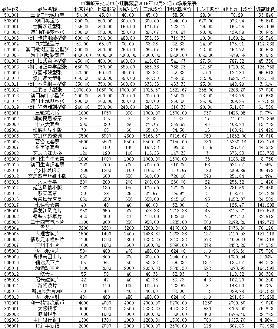 中南邮票交易中心挂牌藏品2015年12月22日市场采集表