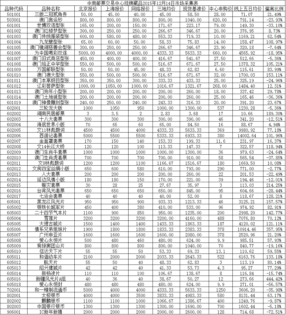 中南邮票交易中心挂牌藏品2015年12月14日市场采集表