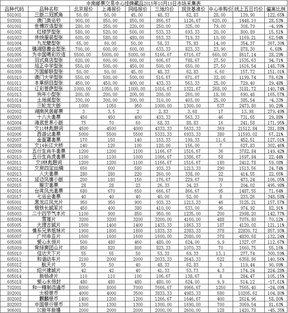 中南邮票交易中心挂牌藏品2015年10月19日市场采集表