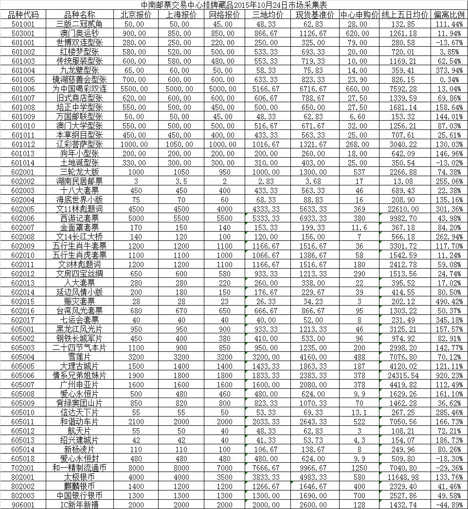 中南邮票交易中心挂牌藏品2015年10月24日市场采集表