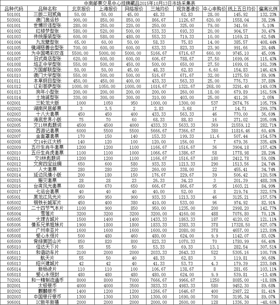 >> 中南邮票交易中心挂牌藏品2015年10月13日市场采集表