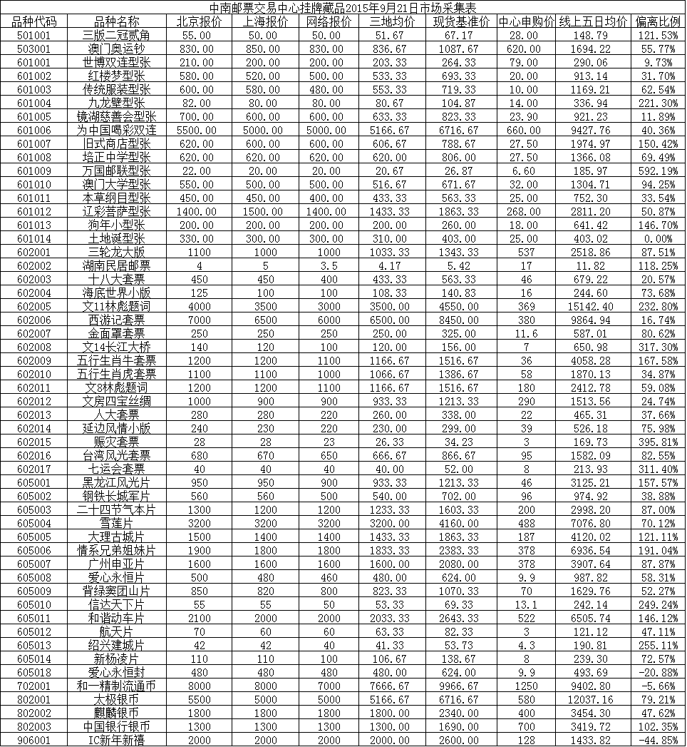中南邮票交易中心挂牌藏品2015年9月21日市场采集表