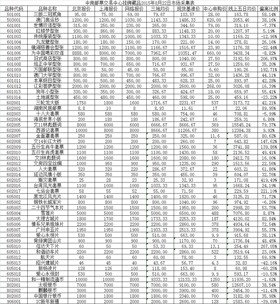 中南邮票交易中心挂牌藏品2015年8月22日市场采集表
