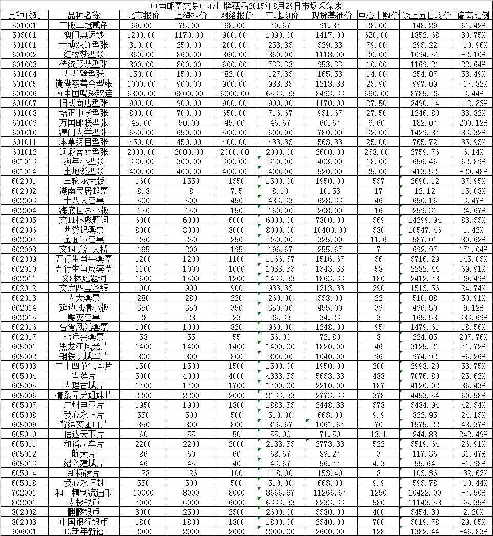 中南邮票交易中心挂牌藏品2015年8月29日市场采集表