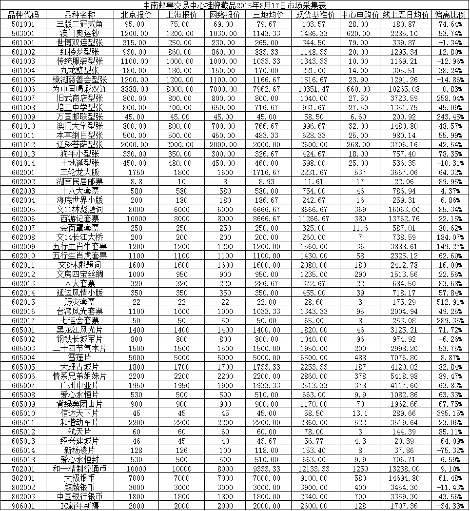 中南邮票交易中心挂牌藏品2015年8月17日市场采集表