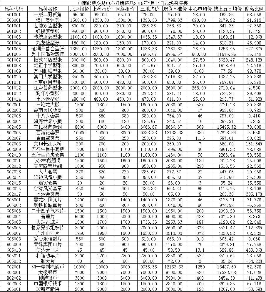 中南邮票交易中心挂牌藏品2015年7月14日市场采集表