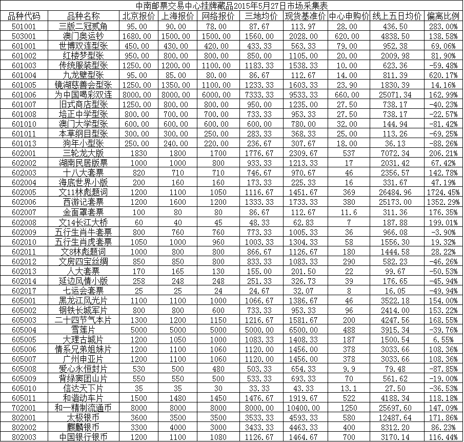 中南邮票交易中心挂牌藏品2015年5月27日市场采集表