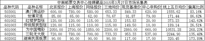 中南邮票交易中心挂牌藏品2015年3月27日市场采集表