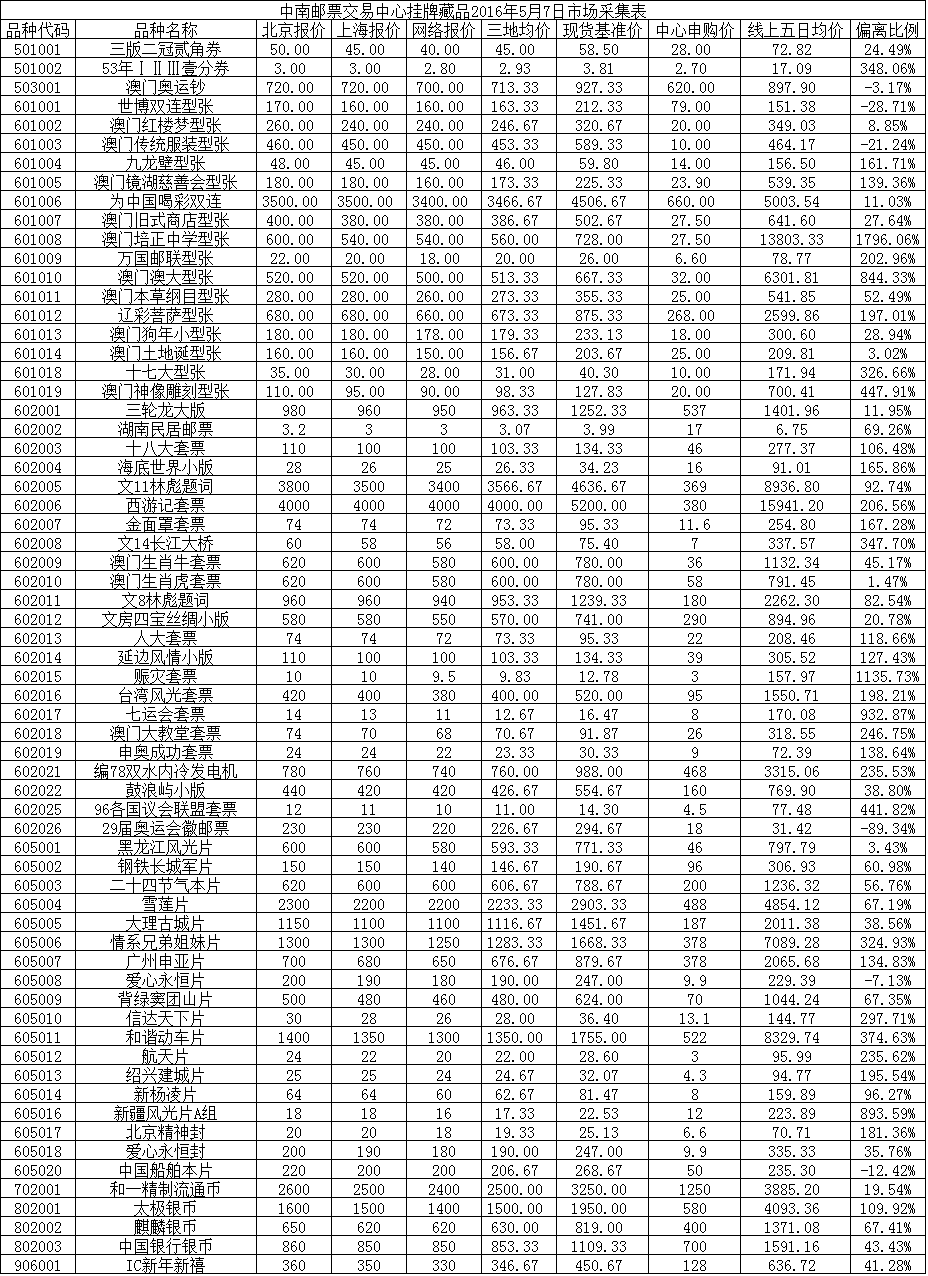 中南邮票交易中心挂牌藏品2016年5月7日市场采集表