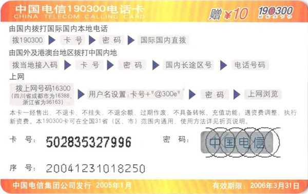 需要特别说明的是:IC-P49新年新禧电话卡是限中国电信(即南方电信公司)在21个省市通用的IC电话卡。该电话卡面值30元整,编号为:CNT-IC-P49。在南方电信所辖的21个省市可以通用,以解决2001年12月12日南北电信分家以来 IC电话卡不能够跨省通用的窘状。同时为了跟好地反馈消费者,该卡还随机赠送10元面值的全国通用的190300卡,190300卡的卡号和密码印在IC电话卡的背面,该IC电话卡有以下几个不同之处:1)它是南方电信成立以来发行的第一套21各省市通用的IC电话卡。2:它有可能暗示着从此以后IC电话卡的发行权再次上缴中央,不得再继续发行地方卡了。3:该IC电话卡的材质使用的纸质,不是一般的IC电话卡所采用的聚乙烯材质,这也显现出中国电信的环保意识,以及大胆创新的意识。4:该卡首次采用正面印画面,背面随机赠送190300卡的做法。