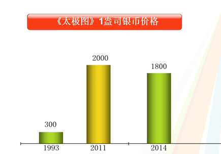 上海卢工市场作为中国金银币最大的集散中心其商户出售价格为1750元/枚附近,而广州、北京的商户出售价格均在1800元/枚附近。从发行以来价格稳步上升,考虑了影响藏品价格的诸多因素,如艺术水平的高低、发行量与存世量的因素、经济发展对艺术品市场的影响、市场热点的转变、审美趣味的变化等因素,另外综合考虑市场报价与实际成交价之间的差距,经过尽可能周密的计算,确定估价1盎司《太极银币》在2014年底的价格为1800元/枚。