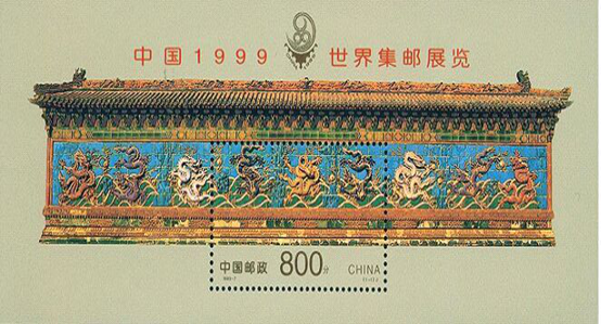 为庆祝1999年世界邮展的举行,中国邮政于当年8月21日特别发行中国1999世界集邮展览(小型张)(J)一套一枚,(又称“九龙壁”小型张),志号1999-7M,面值8元。