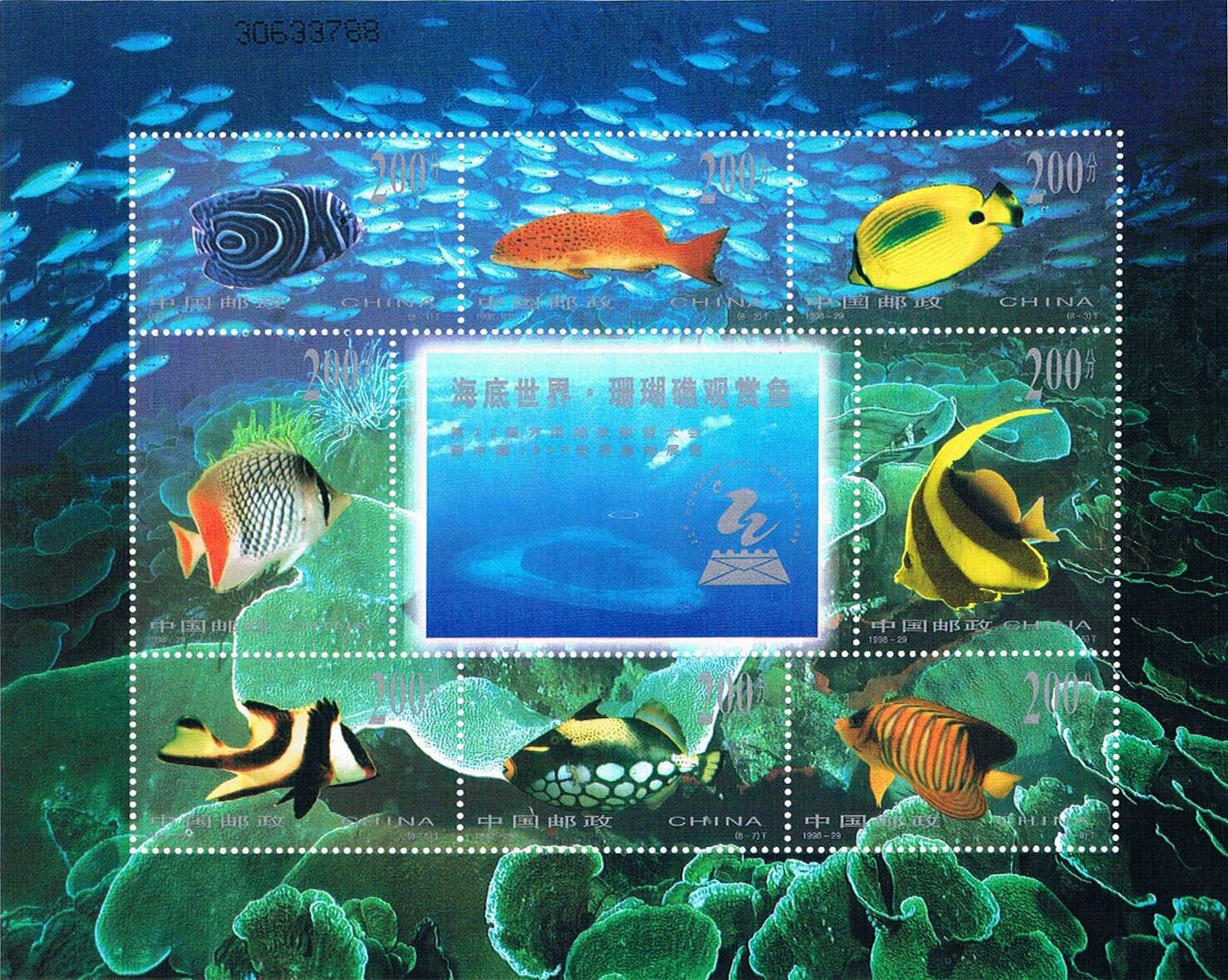 我国南海海域辽阔,鱼类资源丰富。邮票展示的是生长在这片海域中的八种观赏鱼及其珊瑚礁群。它们形态美丽,色彩斑斓,呈现出海底世界美妙的自然奇观。此套邮票是继《黄山》之后,为迎接“第二十二届邮政联盟大会暨中国1999世界集邮展览”而发行的又一套特种邮票。