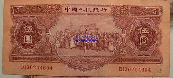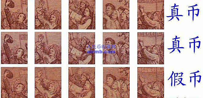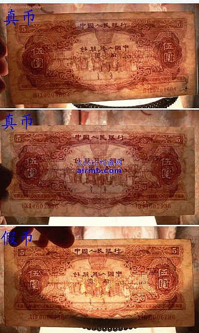 此币刚一上手时,第一感觉是号码比一般的略细一些,字体无力,象小孩子写的字!但我认为有可能下过水,洗后造成的;其次,看水印时显与其他币不一样(二版红五元的水印与3元、2元一样),与手上的红五元比,水印肤浅无力,象画的,又象剪纸似的。我手上有一张下过水的红五元,而且洗的很厉害,但水印还是很有力度,与2元、3元的水印一样;第三,当我查看照片大图时,发现主画面人物表情有很多不一样的地方,表情明显单调粗糙。