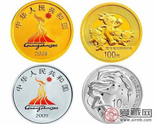 为了纪念第16届亚运会在我国广州举行,中国人民银行在2009年7月28日发行了第16届亚运会金银纪念币。这套纪念币包括金币和银币各一枚,跟人民币一样是我国的法定货币。其中金质纪念币的面额是100元,当时的最大发行量高达30000枚,规格为四分之一盎司;而银质纪念币的面额则是10元,当时的发行量高达60000枚。第16届亚运会金银纪念币的正面图案都是第16届亚运会的彩色会徽,且除了图案之外还印有我国的国号以及发行时的年号;金质纪念币和银质纪念币的背面图案则有所不同,前者的背面图案是第16届亚运会的吉祥物以及跑道,而且除了图案外还有中文字—第16届亚洲运动会以及其面额;后者的背面图案是田径赛以及跳水运动员等造型设计,其他部分的设计跟前者相同。
