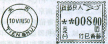 另外,1949年底华南区广东邮政管理局(广州、汕头等地)也曾利用邮资机印制“国内邮资已付”临时邮票。邮票图案中将符志的日期数字取消,邮资戳中仍保留“中华邮政”铭记(图11)。