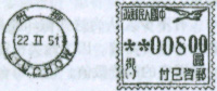 1949年,随着解放战争节节胜利,解放区日渐扩大,华东地区也回到人民手中。华东邮政管理局成立后当即决定将从中华邮政接收的邮资机投入邮政服务。按规定沿用中华邮政的邮资机符志,将铭记改为“华东邮政”,邮资数值以人民币为单位。图1O示华东邮政“大雁居中图”邮资机符志。当时仅有上海、南京、无锡和杭州四地启用邮资机,南京、无锡和杭州使用环球的Multi-Value型机,上海则使用所有4种型号邮资机。已知最早使用日期是1949年6月6日,沿用至新中国成立之后(195O年7月8日)。