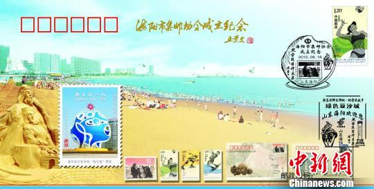 纪念封正面以清新宜人的海阳金沙滩图景铺底,主图为海阳亚沙会会徽“海之魅”雕塑图为纪念封。图为第三届亚沙会纪念邮戳。 纪念封正面以清新宜人的海阳金沙滩图景铺底,主图为海阳亚沙会会徽“海之魅”雕塑,下方依次展示“埋雷图”、本届亚沙会邮票和印有地雷大王于化虎、赵守福、孙玉敏和原中央军委副主席迟浩田将军签名的纪念封图样。纪念封背面印有海阳亚沙会地理位置图示。纪念封由中华全国集邮联会士王景文先生题字,由梁立军、王闳雁策划,于锡亭、刘翠荣撰文,任怀平、刘霖菲设计。志号为SDHY.JF2012-1。