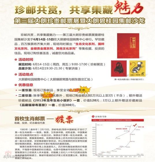 大朗碧桂园联合大朗邮寄共同举办《珍邮共赏,共享集邮魅力》活动,本次将于6月14日—15日在大朗碧桂园销售中心举行。期间将展出首枚价值百万的生肖“猴票”,现在同时开展系列邮票收藏活动,诚邀您品鉴。
