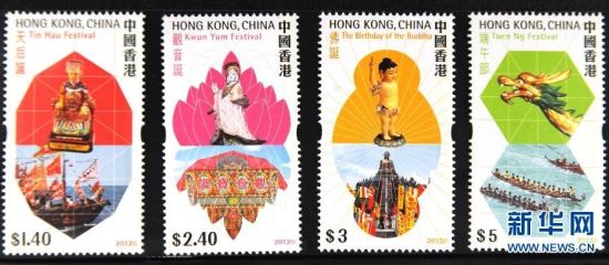 一套四枚的“香港节日”特别邮票(5月17日摄)。 5月17日,香港特区政府邮政署公布,“香港节日”特别邮票将于5月22日推出发售。四枚邮票用色清新悦目,凸显天后诞、观音诞、佛诞和端午节的传统习俗。邮票小型张取材自中秋佳节,色调明快,营造热闹的节日气氛。新华社记者黄本强摄