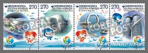 为纪念5月12日至8月12日在韩国丽水举行的世博会,韩国知识经济部邮政事业本部从5月11日起全国邮局出售四种《丽水世博会》纪念邮票。四种邮票分别描绘了展示韩国海洋未来远景的“韩国馆”、世界第一个海上展览馆“主题馆”、代表丽水世博会的造型物“Big-O”、改造旧混凝土仓库的“天空塔”。