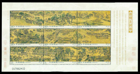 中国邮政发行的《清明上河图》(原画作者为北宋张择端)邮票,一套一版,共9枚,面值9.2元,发行量1020万套。全图分为3个三连张,以胶雕版印刷出了1100多年前原画的缩影。2004年10月18日发行后,最高曾炒到14元/套,但2006年曾跌到了6.8元/套。