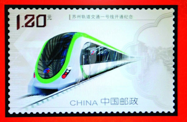4月28日首发的《苏州轨道交通》邮资封,是中国邮政集团发行的第一个以轨道交通为题材的邮资信封,邮资1.2元。其图案是苏州邮政局专门为苏州轨道交通开通而申请的邮资图。据悉,中国邮政集团对邮资图的申请控制十分严格,苏州也仅在“世遗会”那年申请到一枚,此次是第二枚。苏州邮政局在年初就开始申请,此次成功获批主要原因是,苏州是全国地级市中第一个开通轨道交通的城市。